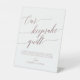 This elegant rose gold calligraphy our keepsake quilt pedestal sign is perfect for a simple wedding. The neutral design features a minimalist card decorated with romantic and whimsical faux rose gold foil typography.