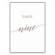 This elegant rose gold calligraphy table nine table number is perfect for a simple wedding. The neutral design features a minimalist card decorated with romantic and whimsical faux rose gold foil typography. The card prints on the front and back (double-sided). Other table numbers in the collection are sold separately.
