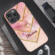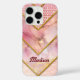 Chic elegant girly faux Glitter rose gold geometric iPhone 16 Case. This iPhone case features an abstract pattern of overlapping triangles, each with an iridescent finish that shifts between pastel pink, rose gold and gold accents. The holographic effect gives each triangle a unique colour as light hits, creating a modern, eye-catching aesthetic.