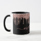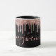 Elegant, Modern Blush Pink Rose Gold Glitter Drips Monogram Script on black custom personalised name or monogrammed mug. Featuring a faux glitter dripping frame, large hand lettered monogram script cursive font with swashes (large size first name) in blush pink or rose gold colour on black background. Easy to personalise it. Great feminine girly gift for girlfriend, mother, birthday, wedding, bridal shower, sweet 16 birthday party and baby shower, business, home office, professional work and for anyone who like pretty glam things.