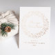 Elegant holiday card with "Merry Christmas" displayed in a rose gold foil calligraphy script encircled by a wreath of rose gold foil snowflakes and pine branches on a white background. Personalise the front of the non-photo holiday card by adding your name and the year. The back of the modern holiday card features your custom message with a beautiful snowflake pattern.
