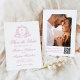Announce your wedding in style with this romantic rose quartz photo save the date card. The front features your monogram initials inside a graceful rose quartz floral crest, with "Save the Date" elegantly displayed in matching calligraphy on a white background. Personalise with your names, wedding date, and location. The back highlights your vertical engagement photo and includes a QR code guests can scan for quick access to your wedding website. With space for custom instructions, this design adds a charming and modern touch to elegant and romantic wedding themes.