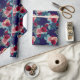 Elegant wrapping paper in navy blue with a floral pattern strewn over it. Roses of peach and pink along with deep red peonies dance in beds of sage, mint and deep blue leaves.