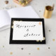 Design features an elegant black background with sepia roses surrounding a white rectangle displaying text. Names of Couple are displayed in an elegant font on front. A golden cross intertwined with two wedding rings is featured in top right corner. Gorgeous design is very pleasing to the eye. Back displays a large image of a beautiful sepia rose against a black background.