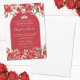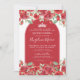 Elegant Floral Red Quinceañera Invitation. This charming watercolor design features vibrant red roses paired with lush greenery and leaves, creating a bold and elegant look for your celebration. The front showcases a striking red arch, with a mix of classic serif and elegant script fonts in white for a sophisticated contrast. A delicate white tiara crown adds a regal touch to the design.