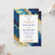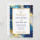 This elegant wedding invitation features an elegant blue and faux gold foil marbled background, with a white frame bordered in gold foil with select word in faux gold glitter.