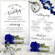 These wedding programs are elegant and tasteful, while still being budget friendly. The design features a single long-stemmed royal blue or cobalt coloured rose lying on its side, reflecting in a pool of water with waves and ripples. The typography features lacy black script calligraphy, and there is room for details on the ceremony, the bridal party, and a short thank you.