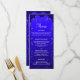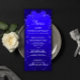 A very elegant, sophisticated royal blue wedding menu which can be easily customised with your own wedding reception food, it features a lush pattern of blue and silver scrolls on the edging, and the reverse side can be customised with the bride and groom's monogram (or left blank if desired).