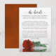 This beautiful wedding enclosure card is designed to give you extra space for whatever information your guests may need, including website, registry, reception, travel, accommodations, or any other details. The card features a gorgeous design with a single reflecting rust orange coloured rose and a lacy script calligraphy title reading "the details." The back is a marbled burnt umber colour.