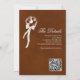 This beautiful wedding invitation features a lovely hand painted watercolor bouquet of roses, flowers, eucalyptus leaves, and greenery in shades of rust orange, burnt umber, and peach. The design features a fancy calligraphy script with a long curly tail making it both modern and classic. Elegant, sophisticated and chic way to invite your friends and family to share in your special day. The back of the card is a marbled burnt orange colour with a QR code and space to direct your guests to your website for more information and to RSVP.