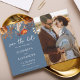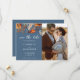 This romantic and elegant fall floral wedding Save The Date photo card presents a chic botanical design of autumnal flowers and greenery in warm tones over a dusty blue background, and is easily customisable with one of your favourite engagement pictures.