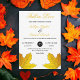 This elegant fall wedding invitation is perfect for a modern autumn wedding. The simple design features gold falling maple leaves with elegant black and gold typography on a white background