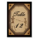 Perfect for Halloween themed weddings, this wedding reception table number card design features a vintage, aged paper look with a deco style octagonal frame and spiders in the corners with two hand-holding skeletons in a look that is rustic gothic elegance in style. Design by Holiday Hearts Designs with vintage imagery (rights reserved).
