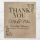These elegant wine bottle labels feature a rustic style, faux parchment paper design background that resembles an antique style scroll.  The text and images on the sticker are printed in a beautiful chocolate brown colour. The text can be personalised with your own names and wedding information. The phrase "Thank You" is printed in a large, sophisticated font, followed  by the titles "Mr." and "Mrs." and the surname of the  new bride and groom in an elegant font. The date of the wedding is printed at the bottom. Two decorative, floral style designs are featured in the top right and bottom left portions.