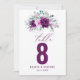 This elegant wedding table number card features a beautiful, rustic design with purple and pink floral accents and delicate greenery at the top. The word "Table" is written in a stylish script font above a large, bold purple number "8".