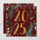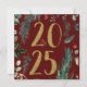 Send best wishes to your family and friends as you say goodbye to the old and greet the New Year with this elegant black New Year's 2025 square greeting card. This elegant 2025 New Years greeting card with an envelope included features a classic burgundy red background with rustic greenery and pretty red berries. A red cardinal sits on the gold number two. Customise the back of this holiday greeting card with a personal note of your own and your signature for a personalised and unique touch.