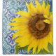 Hand painted floral design, features a huge sunflower by artist, Audrey Jeanne Roberts features a bold, modern Old Havana vintage tile pattern background over a distressed, rustic, shiplap wooden plank background and paired with a huge, Russian Mammoth sunflower which is a variety Audrey Jeanne grows in her extensive gardens and captures from life. Bright golden yellows, orange, rust, yellow green and blue green leaves against a soft white background. Copyright all rights reserved.