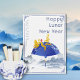 The design features a traditional Chinese folding fan, symbolising wealth, authority, and wisdom. The Chinese calligraphy "如意" translates to "Good fortune as one wishes" and is beautifully complemented by distant grey-blue mountains. Both English and Chinese good wishes are included, creating a simple yet sophisticated design. A red stamp with the Chinese characters "巳蛇" (Year of the Snake) completes the composition, making it a perfect way to celebrate a new beginning.