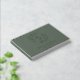 Custom-designed sage green and silver foil wedding guestbook featuring modern elegant foliage wreath monogram with personalised couple's initials, name, and wedding date.