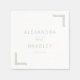 This wedding napkin features a minimalist and elegant design with a clean white background, highlighted by soft sage green text. The layout centres on two names in uppercase serif font, connected by a cursive "and," creating a sophisticated contrast. Decorative corner accents add a subtle geometric touch without overwhelming the simplicity of the typography. The overall style is modern and understated, perfect for adding a refined touch to your special day.
