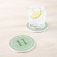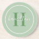Elegant round personalised beverage drink coaster design features a classic custom serif monogram initial in leafy foliage green with your last name in modern white calligraphy script against a sage green background. A simple white circle frames the design. Colour scheme can be customised to coordinate perfectly with your home decor.