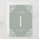 Elegant Sage Green Wedding Table Numbers: Use these vintage, classic table numbers at your wedding reception or event. This design features the word "Table" in an elegant calligraphy with an ornate vintage corners design for a luxe look. It's set in sage green, but you can change the colour to anything you like! Just click "customise more" and change the background colour.