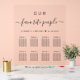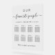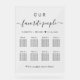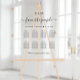 Elegant clear acrylic wedding seating chart sign for up to 8 tables featuring "Our Favourite People" in simple typography and a chic script with swashes, your names and wedding date joined together by a heart and "We're so glad you're here" in modern typography.