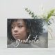 These elegant 2026 graduation announcements feature modern white script classic typography on the front as an overlay on your photo. The back has a dark, black background with simple white text and another photo, along with a scannable QR code to link to graduation ceremony details, or more photos of the graduate.