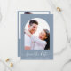 Elegant dusty blue wedding save the date card featuring your photo in an arch frame, "save the date" in a chic white script with swashes and your first names and wedding date joined with a heart. On the reverse side, add an additional photo, personalise your upcoming wedding details and add your names in a signature-like script.