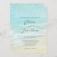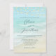 Beautiful aqua blue ocean waves crash against the beach, with string lights decorating the top, on these wedding invitations that are perfect for destination weddings, as well as any beach and coastal themed wedding. The names are written in an elegant script font. For matching products, visit the collection, or message me through Zazzle Chat.