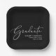 Elegant black graduation party paper plates with "Graduate" in a chic modern white script and the grad's name, school and class year in simple white typography.
