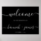 Elegant Script Minimal Black White Wedding Welcome Sign. Classy, simple and modern design template featuring signature handwritten calligraphy script typography.