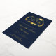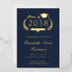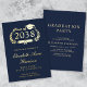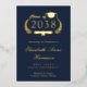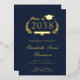 Modern dark blue college graduation party invitation featuring your choice of real gold, silver or rose gold foil on the front. "Class of" is in an illustration of a laurel wreath incorporating a grad cap topper and diploma and the graduate's name is written in an elegant script. Add their school, major, honours or future plans in classic serif typography. On the back, personalise your graduation party details in light gold lettering (you can change the text colour to white by editing in the design tool if you selected silver or rose gold foil for the front).