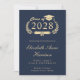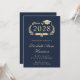 Modern dark blue college graduation party invitation featuring "Class of" in a light gold illustration of a laurel wreath incorporating a grad cap topper and diploma and the graduate's name in an elegant light gold script. Add their school, major, honours or future plans and the graduation party details in simple modern light gold typography.