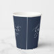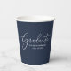 Modern blue graduation party paper cups featuring "Graduate" in an elegant white script and the grad's name and class year in simple modern white lettering.