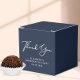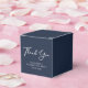 Elegant blue graduation party favour box featuring "Thank You" in a chic white script and the grad's name and party date in simple white lettering.