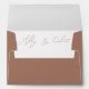 Elegant script calligraphy mocha wedding envelope. The exterior of the envelope features a rich mocha hue that exudes elegance. To elevate its charm, consider customising the envelope flap by incorporating your initials, the names rendered in graceful script typography, and your return address in a crisp white. This thoughtful personalisation will enhance the overall appeal of your wedding invitations, making them truly unique and memorable.