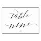Simple Elegant Calligraphy Script Wedding or Dinner Party Table Number Nine written out in beautiful flowing fancy letters. A stylish yet simple formal design in black and white or any background colour you choose. Just click the customise further link, shown under the text personalisation area on the right, and choose your custom colour background. This sign poster template makes it fast and easy to create stunning additions to your wedding decor. Signs can be enlarged, there are many sizes to choose from, as well as options for custom framing and matting. Welcome to our wedding custom signage.