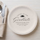 Elegant graduation paper plates featuring a graduation cap with the phrase "Cheers to the Graduate" in a black calligraphy script on a cream background. Personalise the modern graduation paper plates with the graduate's name, school name, and graduation year. The simple graduation plates are perfect to use for your high school or college graduation party.