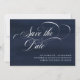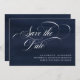 This elegant wedding save the date card features swirly modern calligraphy in white, on a rich, dark blue background.