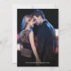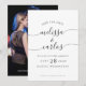 This simple black and white photo save the date features your names in elegant script calligraphy with flourishes and classic typography, and your favourite engagement photo on the back, and is easy to customise with your own wedding information. This is the perfect save the date for a formal, romantic, classic, or modern wedding.