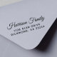 Modern return address self-inking stamp featuring your family name in an elegant calligraphy script and your address in simple lettering. Perfect gift for new homeowners and for sending out wedding invitations, party announcements, everyday correspondence and business mailings.