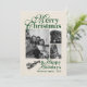 Send warm wishes with this vintage-inspired holiday photo card featuring a festive "Merry Christmas & Happy Holidays" message in classic green script and serif fonts. The design includes space for three cherished family photos, framed beautifully against a soft, neutral background that resembles textured paper. A whimsical Santa sleigh illustration adds charm and nostalgia to this timeless greeting. Perfect for families who love a traditional holiday aesthetic with a personal touch.