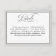 An elegant card to use as an insert with your wedding invitations to provide your guests with details about your wedding or other special occasion. Edit the sample text with any details you wish to share with your guests. The silver-grey background colour surrounding this card can be changed to any other colour to match your wedding colours. To change the border colour, choose "customise further" and select your desired colour from the background colour picker.