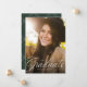 A classic and elegant script graduate in white sits at the bottom of a vertical photo. The custom text includes room for the graduate's name and also school and year details. The hunter green backer has a simple grid pattern, and the colour can be changed by clicking "customise further." Announce your graduate's accomplishment to friends and family with this design!