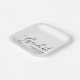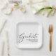 Elegant white graduation party paper plates with "Graduate" in a chic modern script and the grad's name, school and class year in simple typography.