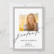 This elegant graduation invitation features two square photo frames, one on the front and a second on the back. The design is accented with modern handwritten style text and a gray border. Personalize the backside with your party invitation details.