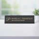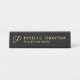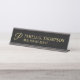 This desk name plate features monogram in gold modern script font style with name and title in gold professional serif font style on black background.