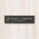 This hanging name plate features monogram in gold modern script font style with name and title in gold professional serif font style on black background.