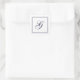 Elegant script monogram with double lined border square stickers. White with navy blue text.